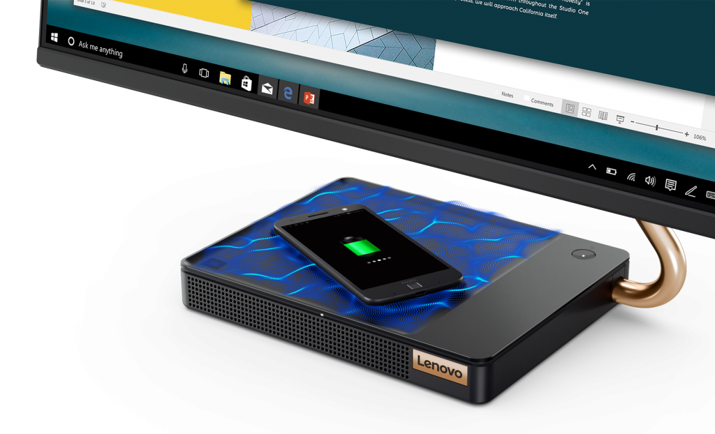 จุดเด่นของเครื่องตัวนี้คือฐานด้านล่าง ที่เป็นศูนย์รวมของชิ้นส่วนต่างๆ จากที่ปกติ All-in-One จะเก็บเอาไว้ที่ด้านหลังจอ แต่รุ่นนี้้ย้ายลงมาอยู่ที่ฐานแทน และสามารถใช้เป็นแท่นชาร์จสมาร์ทโฟนไร้สาย QI ได้ด้วย