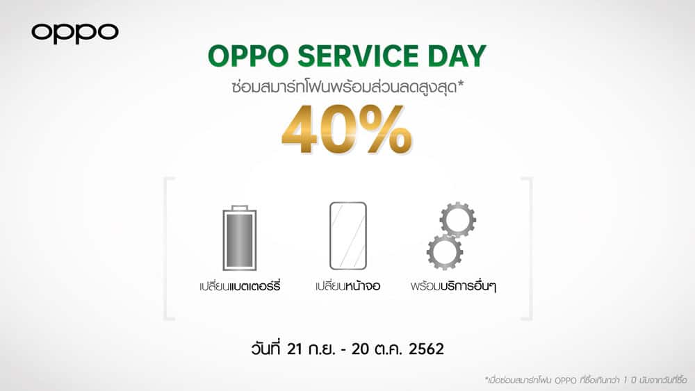 นอกจากนี้ OPPO ยังมอบโปรโมชั่นพิเศษส่วนลดค่าอะไหล่สูงสุดถึง 40% ตั้งแต่วันนี้ – 20 ตุลาคม 2562 สำหรับผู้ใช้ OPPO ที่ซื้อสมาร์ทโฟนรุ่นใดก็ได้เกินกว่า 1 ปี โดยสามารถเข้ารับบริการได้ที่ OPPO Service Center