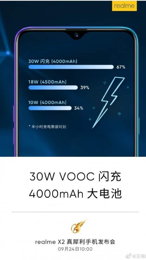 จากข้อมูลรูปที่โพสต์ผ่าน Weibo ให้เห็นฟีเจอร์ของเครื่อง Realme X2 ตัวใหม่นี้ พร้อมกับชาร์ตเทียบให้เห็นความเร็ว ระหว่างระบบชาร์จ 30 วัตต์, 18 วัตต์ และ 10 วัตต์