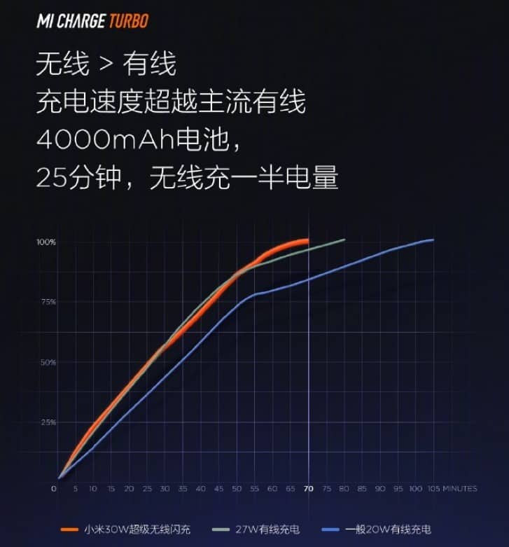 เทียบกับเทคโนโลยีปัจจุบันที่ใช้ใน Mi 9 ที่กำลัง 20 วัตต์ ระยะเวลาการชาร์จ 30 นาที สามารถชาร์จแบตเตอรี่ขนาด 3,300 mAh ได้เพียงแค่ 30 เปอร์เซ็นต์เท่านั้น