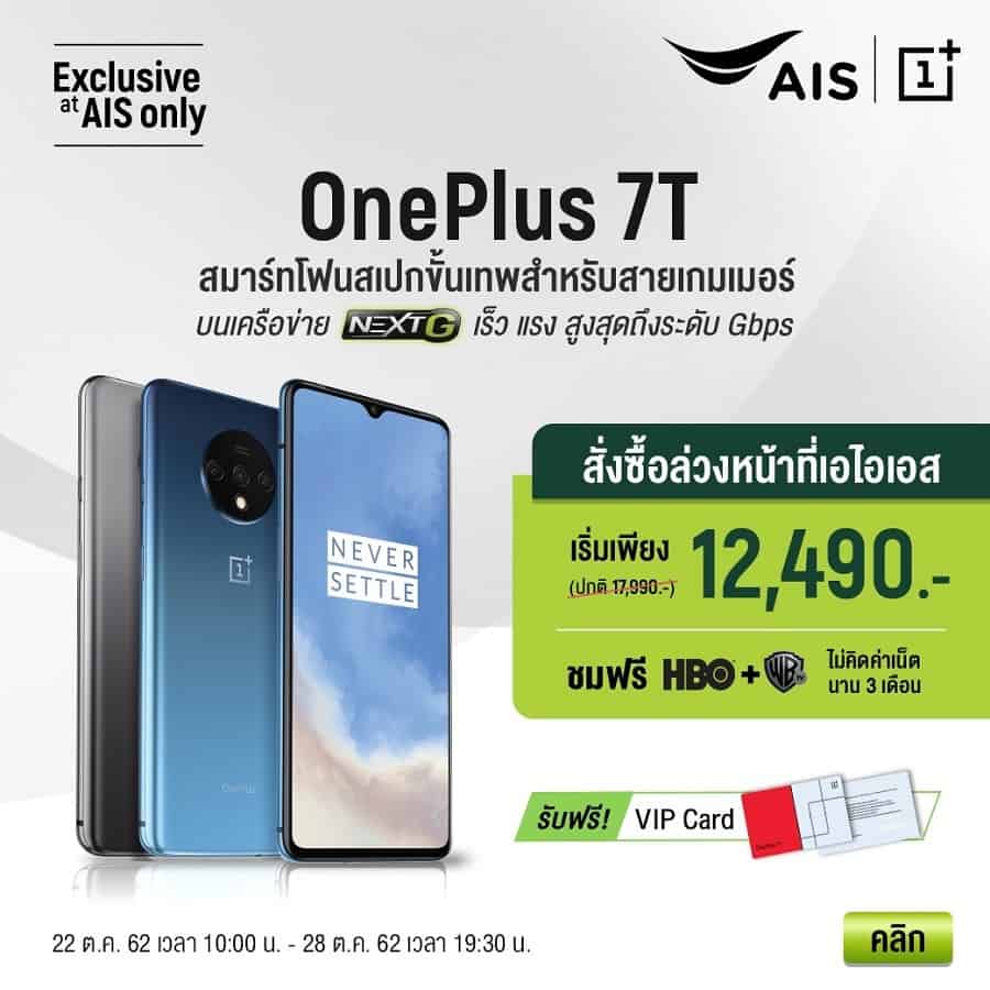 พิเศษมากยิ่งขึ้น สำหรับลูกค้าที่สั่งจอง OnePlus 7T ผ่านทาง AIS พบกับโปรโมชันพิเศษ ให้คุณได้เป็นเจ้าของ ได้ง่ายมากยิ่งขึ้น รับส่วนลดค่าเครื่องสูงสุด 5,500 บาท ราคาเริ่มต้นเพียง 12,490 บาท