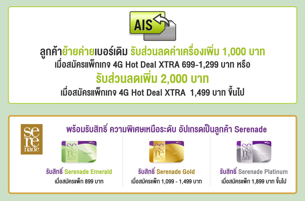 ย้ายค่ายได้ส่วนลดเพิ่ม! 1000 บาท เมื่อสมัครแพ็กเกจ 4G Hot Deal XTRA 699-1299 และจะได้รับส่วนลดเพิ่มถึง 2,000 บาท เมื่อสมัครแพ็กเกจ 4G Hot Deal XTRA 1499 ขึ้นไป พร้อมรับอัพเกรดเป็นลูกค้า Serenade ทันทีที่สมัครแพ็กเกจตามที่กำหนด