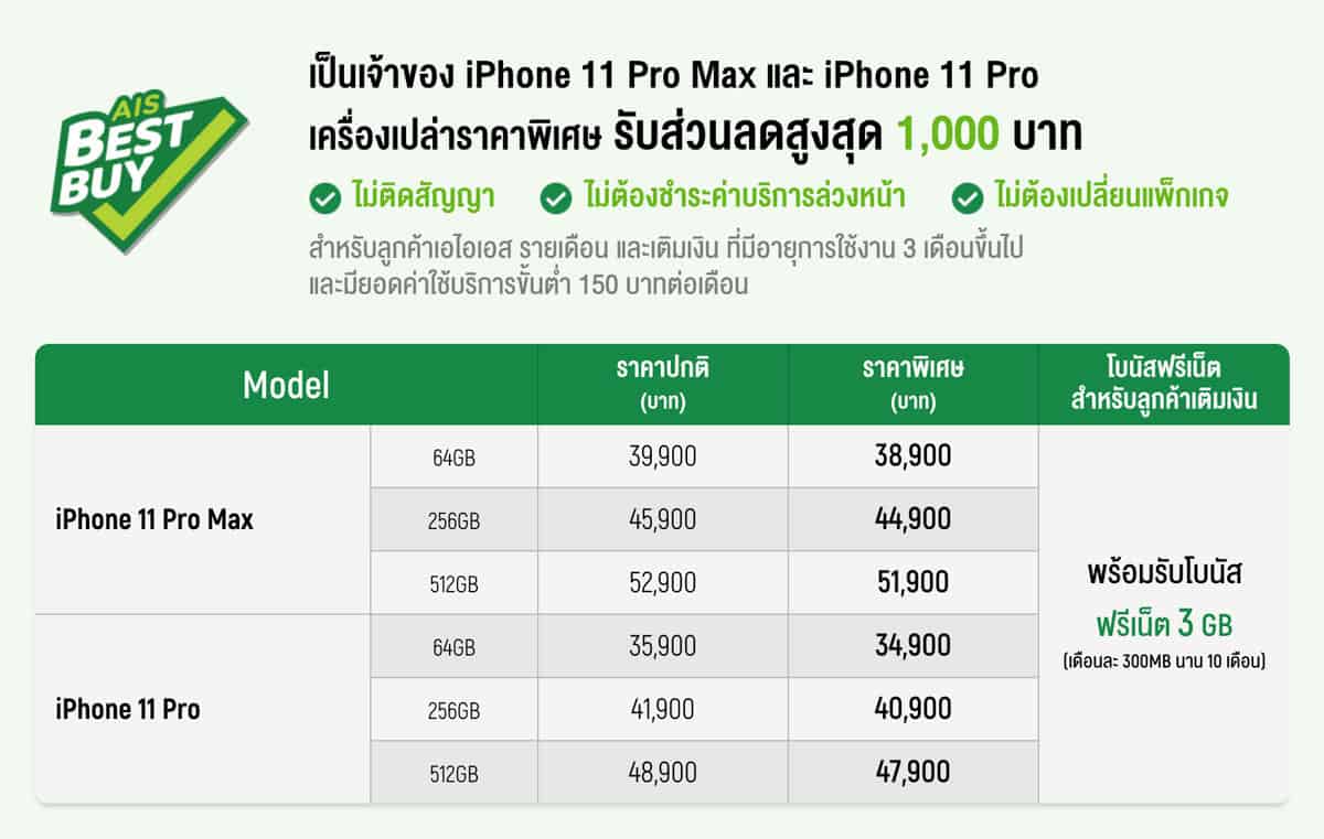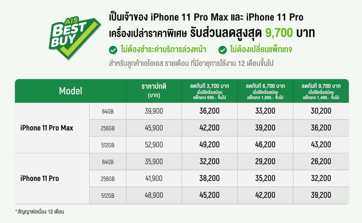 โปรโมชั่น AIS Best Buy สำหรับสั่งซื้อล่วงหน้า iPhone 11 Pro และ iPhone 11 Pro Max รับส่วนลดค่าเครื่องสูงสุด 9,700 บาท ไม่ต้องชำระค่าบริการล่วงหน้า ไม่ต้องเปลี่ยนแพ็กเกจ สำหรับลูกค้า AIS รายเดือน ที่มีอายุการใช้งาน 12 เดือนขึ้นไป (ติดสัญญาต่อเนื่อง 12 เดือน)