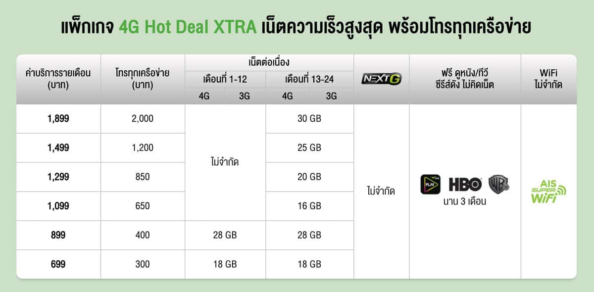 หรือถ้าหากเป็นลูกค้าเปิดเบอร์ใหม่, ย้ายค่ายเบอร์เดิม เปลี่ยนจากเติมเงินเป็นรายเดือน และลูกค้าปัจจุบันในระบบรายเดือน สามารถเลือกซื้อ โปรโมชั่น AIS Hot Deal XTRA ได้ส่วนลดค่าเครื่องสูงสุด 7,700 บาท พร้อมชมฟรี HBO และ WBTV ไม่คิดค่าเน็ตนาน 3 เดือน