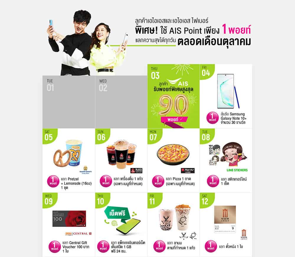 เอไอเอสจัดฉลองทั้งที ไม่ใช่แค่แจกพอยท์เฉยๆ แต่ยังจัดปฏิทินสิทธิพิเศษให้ตลอดทั้งเดือนตุลาคม ตั้งแต่วันที่ 4 ถึง 31 ตุลาคมนี้ เป็นสิทธิพิเศษที่คัดมาให้กับลูกค้าAIS และ AIS Fibre ที่เจ๋งมากๆ ก็คือ ใช้เพียงแค่ 1 พอยท์เท่านั้น ในการแลกสิทธิพิเศษต่างๆ เรียกว่า ที่ได้ฟรีมาจากกิจกรรมครบรอบ 30 ปี ก็มีให้ทุกคนเอามาแลกความสุขความพิเศษนี้ได้ทุกวันแน่นอน