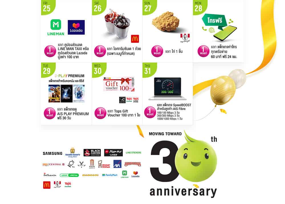 ในวันที่ 3 ตุลาคมที่ผ่านมา เอไอเอสจัดงานใหญ่ ฉลองก้าวเข้าสู่ปีที่ 30 กับเครือข่ายที่อยู่คู่กับคนไทยมาอย่างยาวนาน และในงานนี้ก็ได้มีการประกาศแคมเปญใหญ่ ขอบคุณให้ความสุขด้วยการแจก AIS Points ให้กับลูกค้า AIS และ AIS Fibre ทุกคน สูงสุดถึง 90 พอยท์ และจัดสิทธิพิเศษเอาพอยท์ไปแลกได้ ทุกวันตลอดเดือนตุลาคมนี้ (4-31 ตุลาคม) ซึ่งใช้เพียงแค่ 1 พอยท์ก็แลกได้เลย