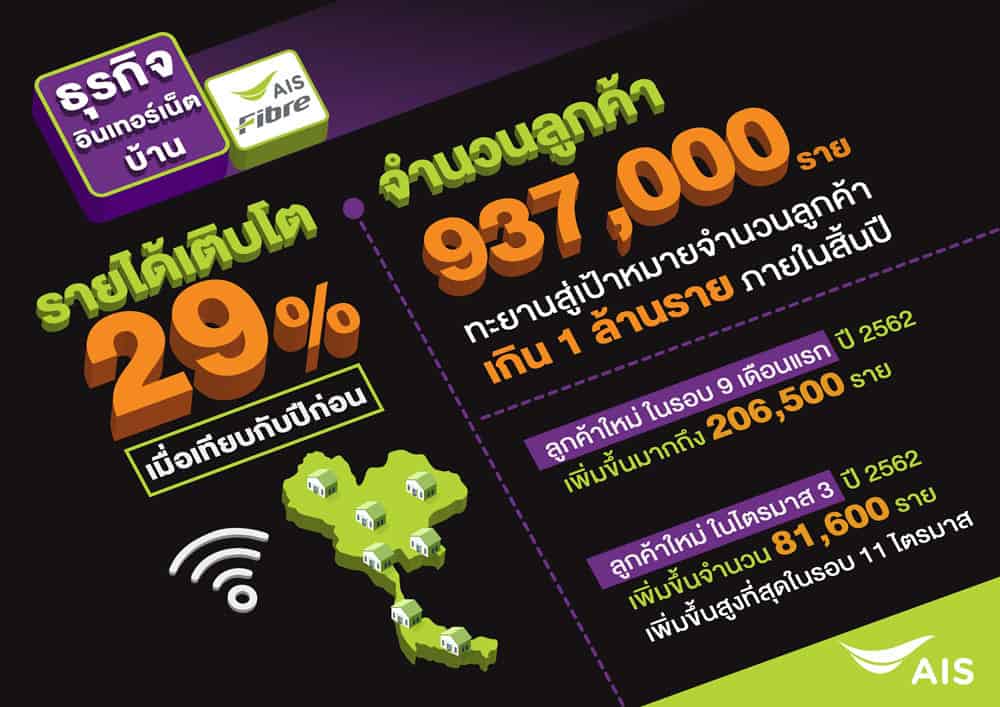 ด้านธุรกิจอินเทอร์เน็ตบ้าน AIS Fibre ยังทำผลงานได้ดีต่อเนื่อง โดยมีรายได้รอบ 9 เดือนเติบโตขึ้น 29% และในไตรมาส 3 ปี 2562 มีจำนวนลูกค้าเพิ่มขึ้น 81,600 ราย สูงที่สุดในรอบ 11 ไตรมาส ทำให้ในปัจจุบัน AIS Fibre มีฐานลูกค้าเพิ่มขึ้นเป็น 930,700 ราย มุ่งสู่เป้าหมาย1 ล้านราย ภายในสิ้นปีนี้ ด้วยกลยุทธ์เน้นหลายบริการในแพคเกจเดียวสำหรับครอบครัว รวมถึงการเพิ่มประสิทธิภาพด้านช่องทางจัดจำหน่ายที่สะดวกและตอบโจทย์ลูกค้า ผ่านทาง LINE Official Account, Website, AIS Call Center 1175 ตอกย้ำการเป็นผู้นำด้านนวัตกรรมเน็ตบ้านตัวจริง การันตีด้วยเครือข่ายอินเทอร์เน็ตบ้านที่เร็วที่สุดในไทย จาก Ookla® Speedtest®