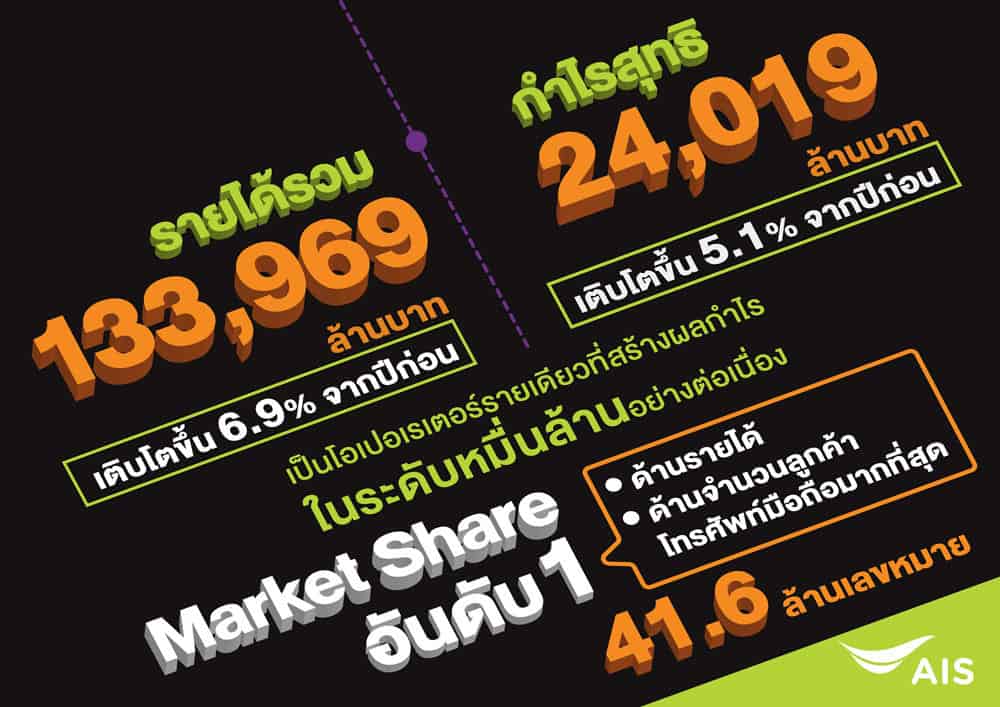 “ส่วนผลประกอบการ ไตรมาส 3 ปี 2562 เอไอเอส ยังคงมีรายได้และกำไรเติบโตต่อเนื่อง โดยมีกำไรสุทธิอยู่ที่ 8,679 ล้านบาท เพิ่มขึ้น 28% เมื่อเทียบกับช่วงเดียวกันของปีก่อน และเพิ่มขึ้น 12% เมื่อเทียบกับไตรมาส 2 ปี 2562 นับเป็นการเติบโตต่อเนื่อง 5 ไตรมาส ติดต่อกัน”