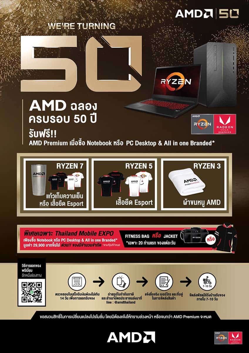 AMD ฉลองก้าวเข้าสู่ปีที่ 50 จัดโปรโมชั่นพิเศษในงาน Thailand Mobile EXPO วันที่ 3 – 6 ตุลาคม ศกนี้ โปรโมชั่นสมนาคุณลูกค้าภายในงานที่เลือกซื้อ Notebook หรือ PC Desktop และ All in One Branded ที่ใช้ขุมพลังจากชิปประมวลผลรุ่น AMD Ryzen 3, 5 และ 7 รับฟรี! ของพรีเมี่ยมจาก AMD ณ บูธ M4 ประกอบด้วย