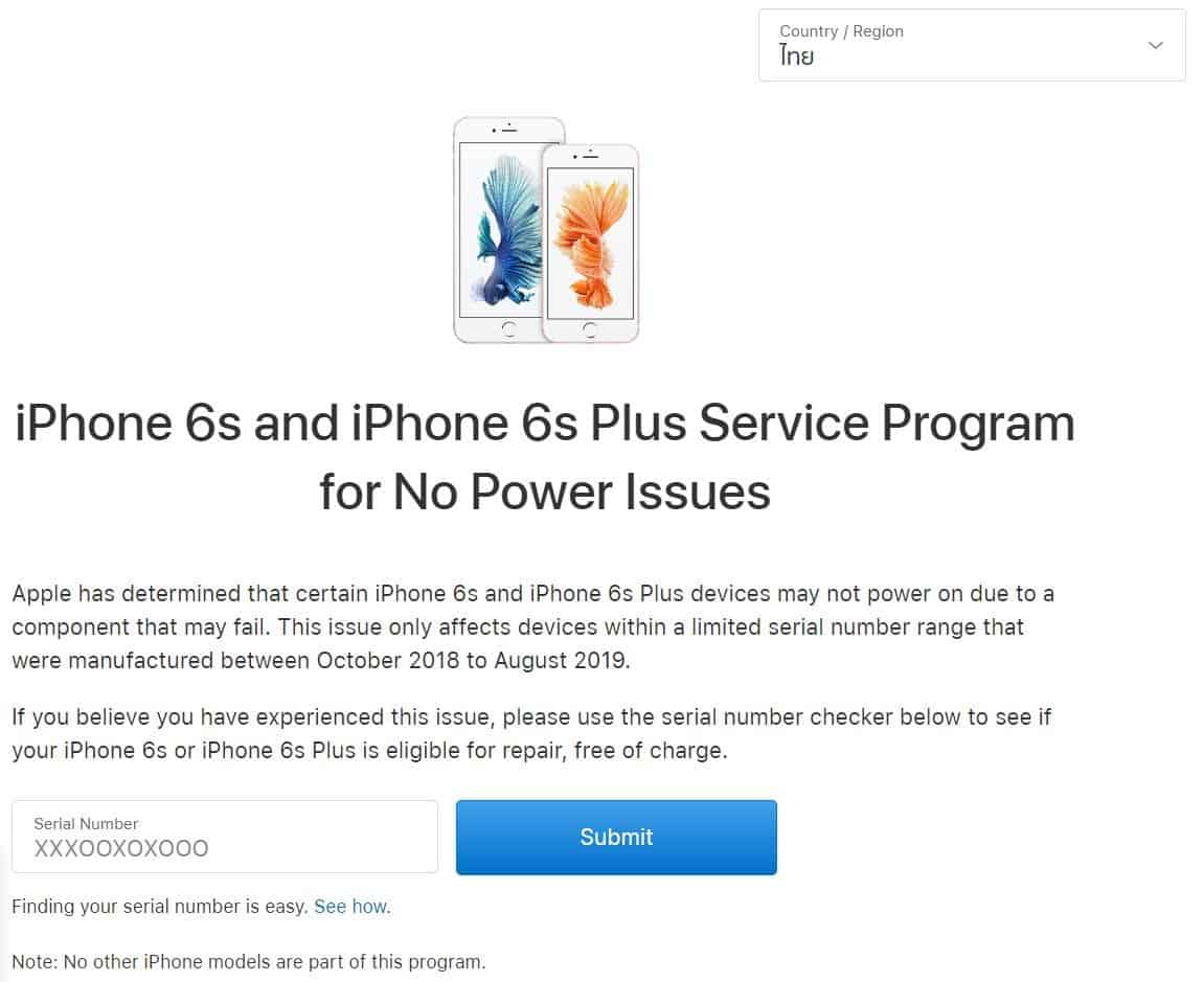 ใครที่ใช้งาน iPhone 6s และ iPhone 6s Plus ที่ผลิตในช่วงเวลาที่กำหนด สามารถเข้าไปตรวจเช็คหมายเลขซีเรียลของเราได้ที่ https://support.apple.com/iphone-6s-6s-plus-no-power-issues-program