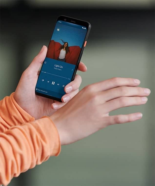 รูปที่น่าสนใจที่สุดก็คือการโชว์มือของผู้ใช้ ที่ดูเหมือนจะมีการปัดผ่านหน้าจอไป เพื่อทำการเลื่อนไปเพลงต่อไป คาดว่าจะเป็นฟีเจอร์ Air Gesture ใหม่ของเครื่องรุ่นนี้ จากเซ็นเซอร์เรดาร์ Soli ที่มีการติดตั้งเพิ่ม แตกต่างจากสมาร์ทโฟนในตลาด