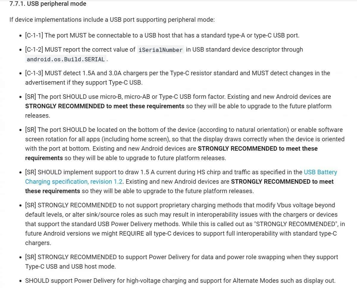 ข้อความจากเอกสาร Compatibility Definition Document ของ Android 7.0 Nougat ที่ออกมาตั้งแต่ปี 2016 ก็มีข้อความเกี่ยวกับเรื่องมาตรฐานการชาร์จว่า ไม่แนะนำ ให้ผู้ผลิต รองรับวิธีการชาร์จไฟที่เป็นกรรมสิทธิ์ ที่อาจส่งผลให้เกิดปัญหาการทำงานร่วมกับที่ชาร์จ หรือ อุปกรณ์ที่รองรับวิธีการจ่ายไฟตามมาตรฐาน USB เป็นอย่างยิ่ง