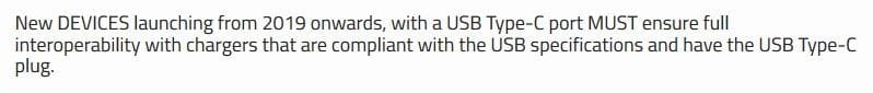 ใจความหลักๆ ระบุไว้ประมาณว่า อุปกรณ์ใหม่ที่ออกปี 2019 เป็นต้นไป ที่มากับพอร์ท USB-C ต้องมั่นใจว่า สามารถใช้งานร่วมกับอุปกรณ์ชาร์จที่สอดคล้องกับข้อกำหนดและมาตรฐาน USB แบบเต็มรูปแบบ และ มีปลั๊กแบบ USB-C
