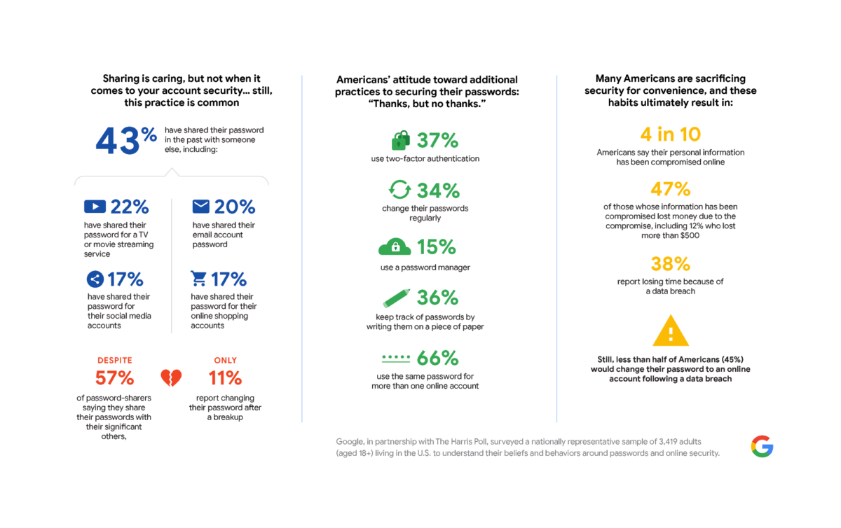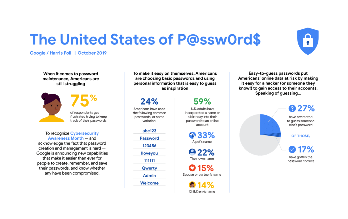 จากข้อมูลผู้ใช้งานจำนวนมาก ที่ชอบตั้งรหัสผ่านที่ง่ายต่อการคาดเดา เช่น Abc123, Password1111 หรือ P@ssw0rd เหล่านี้เป็นต้น ผู้ใช้งานชาวอเมริกันกว่า 66 เปอร์เซ็นต์ ยอมรับว่าใช้รหัสผ่านเดาง่ายในหลายเว็บที่ตัวเองเข้า