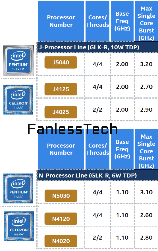 กลุ่ม 10 วัตต์ประกอบด้วย Pentium Silver J5040 ความเร็วสูงขึ้นอีก 500 MHz และความเร็ว Boost สูงขึ้นอีก 400 MHz,