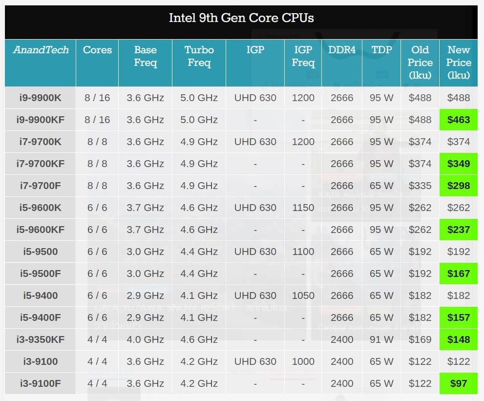 จากที่ Intel โดนวิพากษ์วิจารณ์อย่างมาก ในเรื่องของราคาชิป Gen 9th รุ่นที่ตัดชิปกราฟิกในตัวออกไป แต่ก็ไม่ได้ลดราคาลงเลย เป็นรุ่นรหัส F และ KF แต่ตอนนี้มีการปรับแผนมาใหม่ ลดราคาชิปให้ถูกลงกว่าเดิมแล้ว