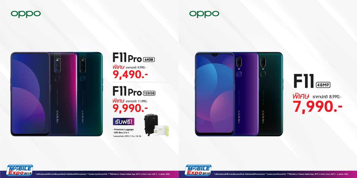 OPPO F11 Pro 64GB มาในราคา 9,490 บาท จากราคาปกติ 9,990 บาท และเมื่อซื้อ OPPO F11 Pro 128GB ราคา 9,990 บาท จากปกติ 11,990 บาท รับเลยทั้งกระเป๋าเดินทางสุดพรีเมี่ยม พร้อม Gift Box 2 in 1 พิเศษเฉพาะในงานเท่านั้น! นอกจากนี้ยังมีโปรฯ OPPO F11 ราคาพิเศษ 7,990 บาท จากปกติ 8,990 บาท