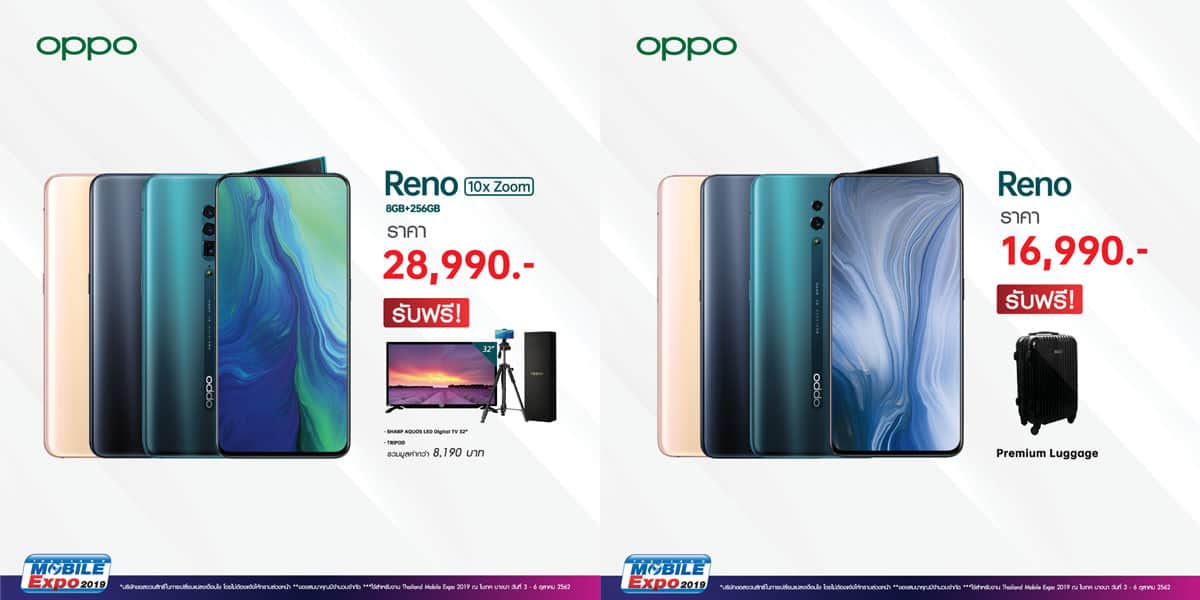โปรโมชั่น OPPO Reno 10x Zoom ราคา 28,990 บาท มอบของแถมจัดเต็ม ทั้ง SHARP AQUOS LED DIGITAL TV ขนาด 32 นิ้ว และขาตั้งกล้อง OPPO Tripod (จำนวนจำกัด) รวมมูลค่ากว่า 8,190 บาท! หรือเลือกซื้อ OPPO Reno ภายในงาน 16,990 บาท รับฟรี! กระเป๋าเดินทางสุดพรีเมี่ยม
