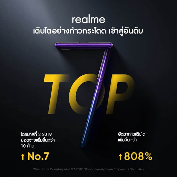 Counterpoint สถาบันการวิจัยระดับสากล ได้ประกาศรายงานเกี่ยวกับการจัดส่งโทรศัพท์มือถือสำหรับไตรมาส ที่ 3 ปี 2562 โดยตามรายงานระบุว่า realme แบรนด์สมาร์ทโฟนเพื่อคนรุ่นใหม่ ได้ก้าวขึ้นสู่ลำดับที่ 7 ของการจัดลำดับสมาร์ทโฟนระดับโลกอย่างรวดเร็ว หลังจากติดลำดับ 1 ใน 10 ไปเมื่อไตรมาสที่ 2 ของปี 2562 และที่ตอกย้ำความก้าวหน้าอย่างรวดเร็วของ realme คือการขนส่งที่มากกว่า 10 ล้านเครื่องเฉพาะแค่ไตรมาสที่ 3 ของปี 2562 โดยคิดเป็นเปอร์เซ็นต์การเติบโตมากถึง 808% จากปีที่แล้ว ซึ่งเป็นสมาร์ทโฟนอันดับ 1 ของโลกที่มีการเติบโตเร็วที่สุดเมื่อเทียบกับสมาร์ทโฟนแบรนด์อื่นนับจากวันเปิดตัว