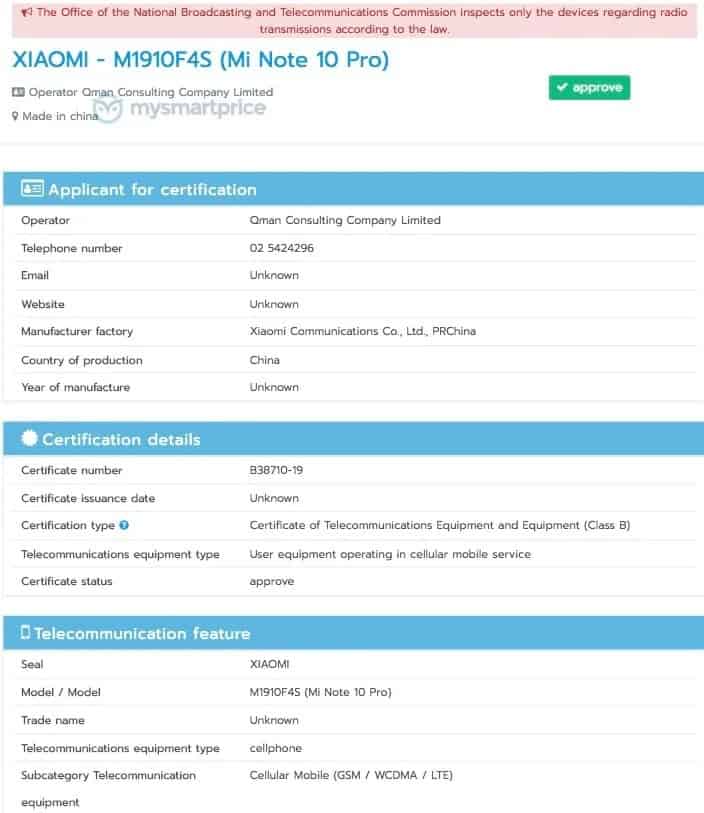 สมาร์ทโฟนตระกูล Note ตัวใหม่ของ Xiaomi 2 รุ่น คือ Mi Note 10 และ Mi Note 10 Pro ผ่านการรับรองจาก กสทช. เป็นที่เรียบร้อยแล้ว