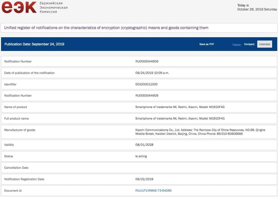 ตัว Mi Note 10 นั้น มีรหัสรุ่นเป็น M1910F4G ส่วนตัว Mi Note 10 Pro ใช้รหัสรุ่นว่า M1910F4S