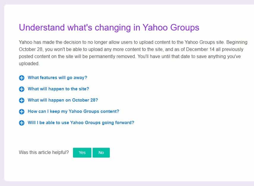 Yahoo Group เริ่มปิดเว็บไซต์แล้ว โดยจะแบ่งขั้นตอนการปิดเป็น 2 ช่วง เริ่มจากการปิดไม่รับ Content ใหม่ใดๆ จากผู้ใช้งานตั้งแต่วันที่ 21 ตุลาคม ส่งผลให้ไม่สามารถโพสต์อะไรลงไปบนเว็บไซต์เพิ่มเติมได้อีก