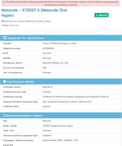 ข้อมูลใหม่ล่าสุดจากหน่วยงาน คณะกรรมการกิจการกระจายเสียง กิจการโทรทัศน์ และกิจการโทรคมนาคมแห่งชาติ หรือ กสทช. มีรายชื่ออุปกรณ์ใหม่ที่ผ่านการรับรองออกมาในชื่อว่า Motorola One Hyper