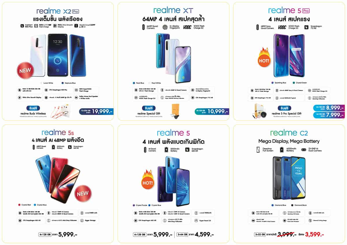 - realme X2 Pro ‘แรงเต็มขั้น พลังเรือธง’ ราคาเริ่มต้นที่ 19,999 บาท รับฟรีทันทีหูฟัง realme Buds Wireless มูลค่า 1,999 บาท พร้อมการรับประกันตัวเครื่องนาน 24 เดือน และสิทธิ์การผ่อนชำระทางบัตรเครดิตที่ร่วมรายการ 0% นานสูงสุด 24 เดือน