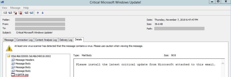 E-mail ที่ว่า จะมาในรูปแบบภาษาอังกฤษ และ ดูคล้ายกับว่า มันถูกส่งมาจาก Microsoft โดยใช้ชื่อเรื่องที่ส่งมาว่า