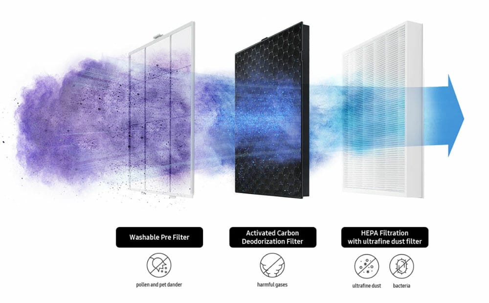 ระบบการฟอกอากาศ ใน เครื่องฟอกอากาศ ซัมซุง BLUE SKY AX7500 จัดมาให้ด้วยแผ่นกรองอากาศถึง 3 ชั้น