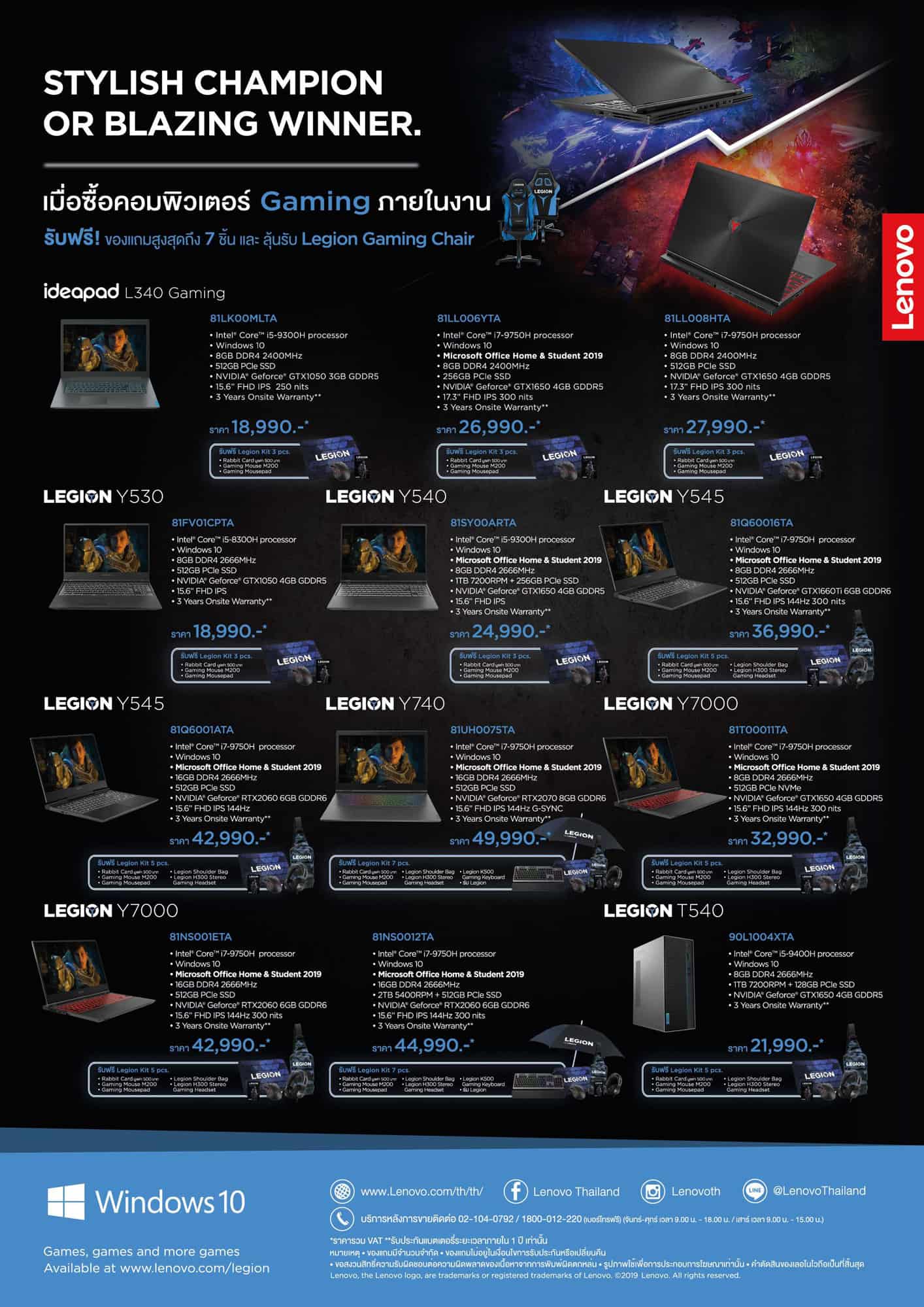 • รับฟรี!! ผลิตภัณฑ์ Legion จำนวน 7 ชิ้น เมื่อซื้อ Lenovo Legion Y740 มูลค่า 59,990 บาท สุดยอดแล็ปท็อปเพื่อเกมเมอร์ตัวจริง ขนาด 17.3 นิ้ว มาพร้อมหน่วยประมวลผล Intel® Core™ i7-9750H ชิปกราฟิก NVIDIA® GeForce RTX 2070 Max-Q หน้าจอแบบ FHD IPS Anti-glare ชุดลำโพง Dolby Atmos® เทคโนโลยีคีย์บอร์ด CORSAIR iCue RGB backlit รองรับ Anti-ghosting โปรแกรม Microsoft Office Home & Student 2019 และระบบปฏิบัติการ Windows 10 Home
