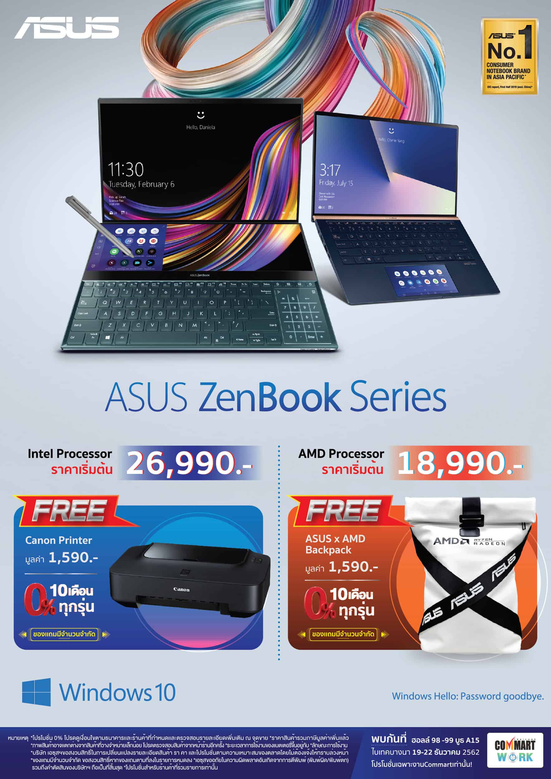 New ZenBook 13/14/15 วางจำหน่ายครั้งแรก ที่ งาน Commart Work 2019 ราคาเริ่มต้นที่ 26,990 บาท พร้อมโปรโมชั่นพิเศษ ฟรี! เครื่องปริ้นเตอร์ Canon มูลค่า 1,590 บาท เมื่อซื้อสินค้าภายในงาน