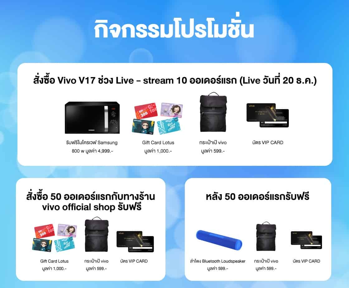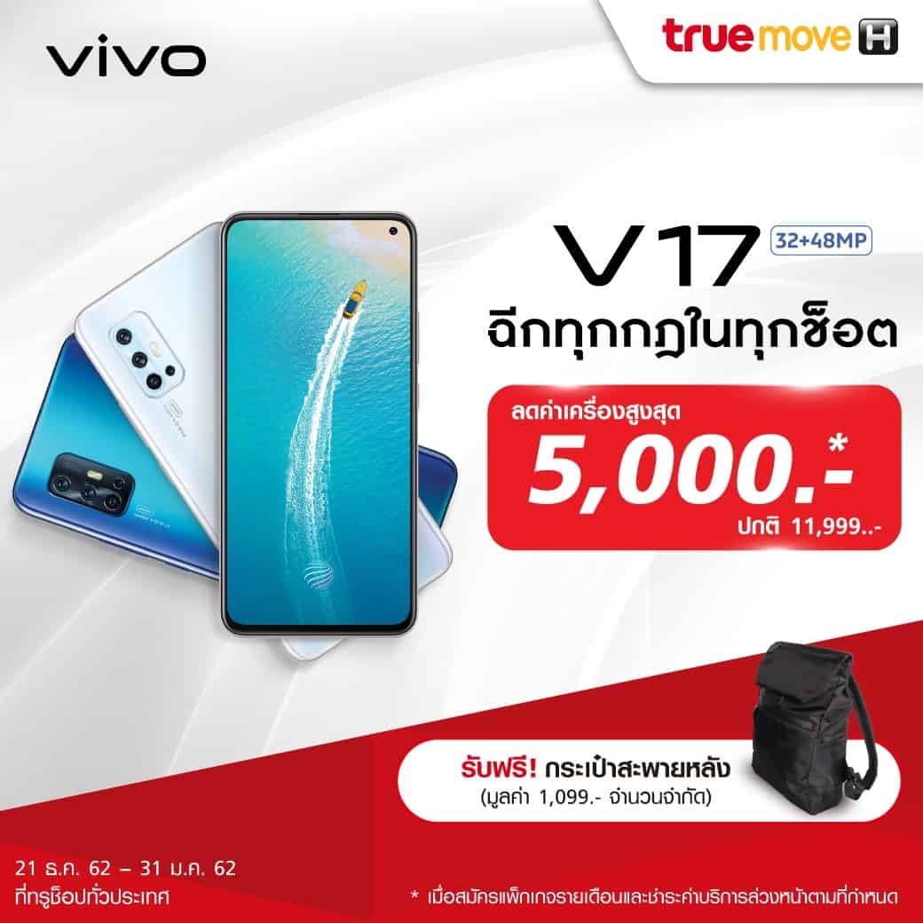 ลูกค้าเปิดเบอร์ใหม่, ย้ายค่ายเบอร์เดิม, เปลี่ยนเติมเงินเป็นรายเดือน และลูกค้าปัจจุบันแบบรายเดือน ซื้อ Vivo V17 โปรโมชั่นร่วมกับ TrueMove H ตั้งแต่วันที่ 21 ธันวาคม 2562 ถึง 31 มกราคม 2563 ที่ทรูช็อปทั่วประเทศ รับฟรี กระเป๋าสะพายหลัง Vivo มูลค่า 1099 บาท พร้อมรับส่วนลดค่าเครื่องสูงสุดถึง 5,000 บาท เมื่อสมัครแพ็กเกจรายเดือนและชำระค่าบริการล่วงหน้าตามที่กำหนด