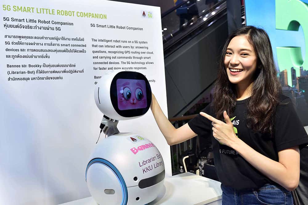 - 5G Smart Little Robot Companion หุ่นยนต์อัจฉริยะทำงานผ่าน 5G สามารถพูดคุยและตอบคำถามแก่ผู้มาใช้งาน ผ่านเทคโนโลยี 5G ช่วยให้จดจำการสั่งการ Smart Connected Devices และ การตอบสนองของหุ่นยนต์เป็นไปได้อย่างรวดเร็วและถูกต้องแม่นยำมากยิ่งขึ้น โดย Bannee และ Bookky เป็นหุ่นยนต์บรรณารักษ์ (Librarian-Bot) ที่ได้รับการพัฒนาเพื่อปฏิบัติงานที่สำนักหอสมุด มหาวิทยาลัยขอนแก่น สามารถสื่อสารกันเองและสื่อสารกับคนได้