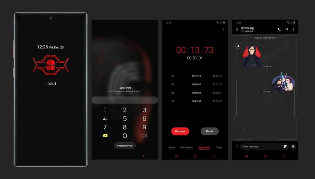 ในเครื่อง จะมีทั้งภาพกราฟฟิค Wallpaper เคลื่อนไหว ริงโทน และไอคอนแอป ที่เป็นธีมของสตาร์วอร์ส พร้อมทั้งมีหูฟัง Galaxy Buds ที่ตัวตลับด้านนอกเป็นสีดำ แล้วข้างในเป็นสีแดง สีสันดุดันเข้ากับชุด