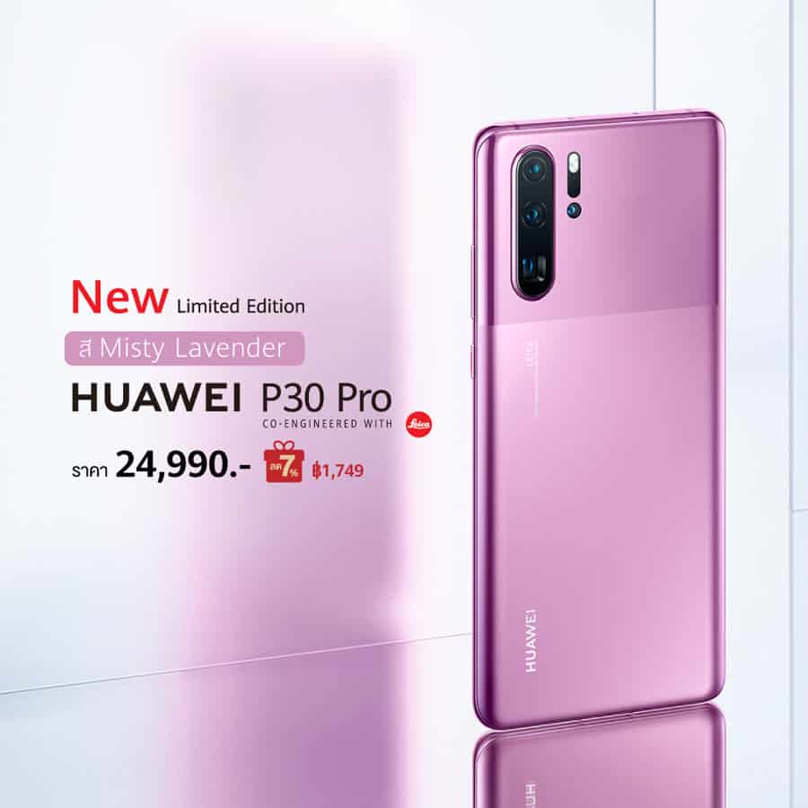 HUAWEI P30 Pro Misty Lavender ราคา 24,990 บาท และรับส่วนลดเพิ่มทันทีอีก 7% (ลดเพิ่มทันทีอีก 1,749 บาท) ในแคมเปญส่งท้ายปี Together 2020 ตั้งแต่วันนี้ – 12 มกราคม 2020 โดยจะวางจำหน่ายตั้งแต่วันที่ 20 ธันวาคม เป็นต้นไป สามารถจับจองเป็นเจ้าของได้ที่หัวเว่ย แบรนด์ ช้อป ร้านตัวแทนจำหน่าย และร้านค้าที่ร่วมรายการทั่วประเทศ