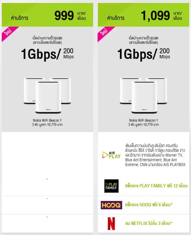 ความคุ้มค่าที่ตอนนี้ AIS Fibre จัดให้ ก็คือ SUPER MESH WIFI แพ็กเกจอินเทอร์เน็ตไฟเบอร์ ที่ให้ความเร็วดาวน์โหลด/อัปโหลด สูงสุดถึง 1Gbps / 200Mbps ในราคาค่าบริการเริ่มต้นที่ 999 บาท/เดือน โดยจะมีตัวNOKIA WIFI BEACON 1 ให้มาด้วยถึง 3 ตัว รวมมูลค่า 10,770 บาท โดยสัญญาการใช้งาน 24 เดือน และจะมีค่าแรกเข้า 4,800 บาท (รับเงินคืน 200 บาท/เดือน จนครบอายุสัญญา)