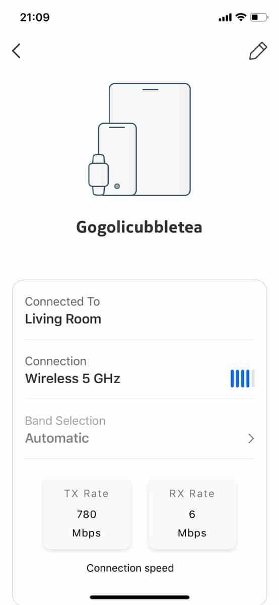 การเชื่อมต่อกับเสาสัญญาณ ตัวระบบจะเลือกให้เองว่าจะเป็น 2.4GHz หรือ 5GHz ตามความเหมาะสมของระยะห่างจาก Access Point โดยที่ในแอปจะดูสปีดการใช้งานได้สูงสุดของแต่ละอุปกรณ์ได้เลย รวมถึงปรับแต่งสิทธิการเชื่อมต่อของอุปกรณ์ได้เองตามที่เราต้องการ
