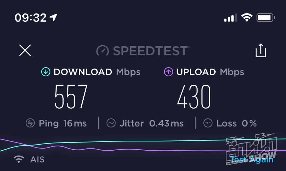 ทดสอบความเร็วสปีดของ AIS Fibre ผ่านตัว NOKIA WIFI BEACON 1 อันนี้ผมทดสอบการเชื่อมต่อด้วย iPhone 11 Pro เกาะเสา 5GHz ของ Access Point ตัวลูกที่พ่วงจากตัวหลักมากระจายสัญญาณที่ชั้น 2 ของบ้าน แพ็กเกจที่ใช้ปัจจุบันของผมเป็น 500/500Mbps ก็จะเห็นได้ว่าวิ่งได้เต็มสปีด แรงดีไม่มีตก