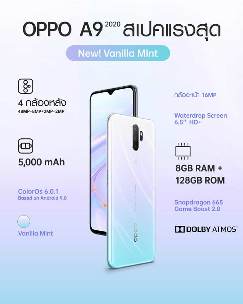 OPPO A9 2020 สเปคแรงสุด เปิดตัวสีใหม่ “Vanilla Mint” พร้อมวางจำหน่ายแล้วในราคาเพียง 8,990 บาท พร้อมสเปคแรงสุด แบตอึดสุด พร้อมกล้องหลังทรงพลัง กับดีไซน์และสีอันสุดพิเศษที่นำแรงบันดาลใจจากแสงแดดในยามบ่ายอันเงียบสงบ ในห้องนอนที่มองเห็นทะเลและเกลียวคลื่นกระทบฝั่งอยู่ด้านนอก พร้อมอากาศอันแสนสดชื่นที่พัดผ่านม่านสีขาวนวล รวมทั้งยังนำเทคโนโลยีสีในระดับนาโนมาใช้ในดีไซน์ด้วยการไล่เฉดสีจากสีขาวไปจนถึงสีฟ้าอมเขียวราวกับน้ำทะเล ที่เป็นเอกลักษณ์ โดดเด่นไม่ซ้ำใคร สวยสะกดทุกสายตา