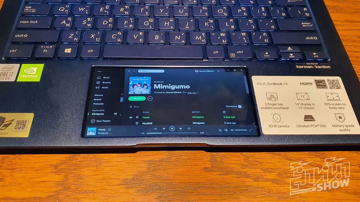 ตัวแป้นคีย์บอร์ด ขนาดมาตรฐาน มีไฟ Backlit แป้นสูง 1.4 มม. ตำแหน่งวางเรียงพิมพ์ได้คล่องมือ และมาที่พระเอกของรุ่นนี้ก็คือแทร็คแพดแบบ ScreenPad 2.0 เวอร์ชั่นใหม่ที่ปรับปรุงหลายอย่างให้ใช้งานได้ดีขึ้น มีประโยชน์เพิ่มขึ้นกว่าเดิมหลายอย่าง มาด้วยขนาด 5.65 นิ้ว ที่นอกจากจะใช้เป็นแทร็คแพดปกติแล้ว มันก็คือหน้าจอเสริมที่ 2 ที่เชื่อมต่อและทำงานคู่กับจอใหญ่ได้ โดยที่ Asus มีซอฟต์แวร์ SceenXpert เวอร์ชั่นใหม่ มาเสริมรูปแบบการทำงานได้ประสิทธิภาพมากขึ้น ส่วนจะดีขึ้นขนาดไหน เดี๋ยวจะเล่าให้ฟังอีกที