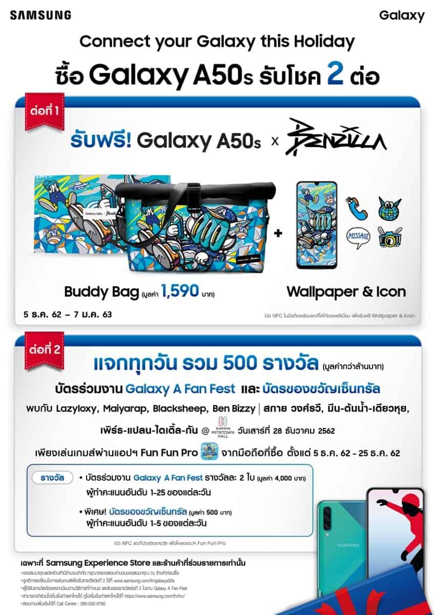 หรือเมื่อซื้อ ซัมซุง กาแลคซี่ เอ 50 เอส รับไปเลย Buddy Bag สุดเท่ห์ ฝีมือการออกแบบของ “Benzilla” ศิลปินแนวสตรีทชื่อดัง อีกทั้งยังมาพร้อมกับวอลเปเปอร์และ icon ลายลิมิเต็ดทั้ง 2 รุ่น
