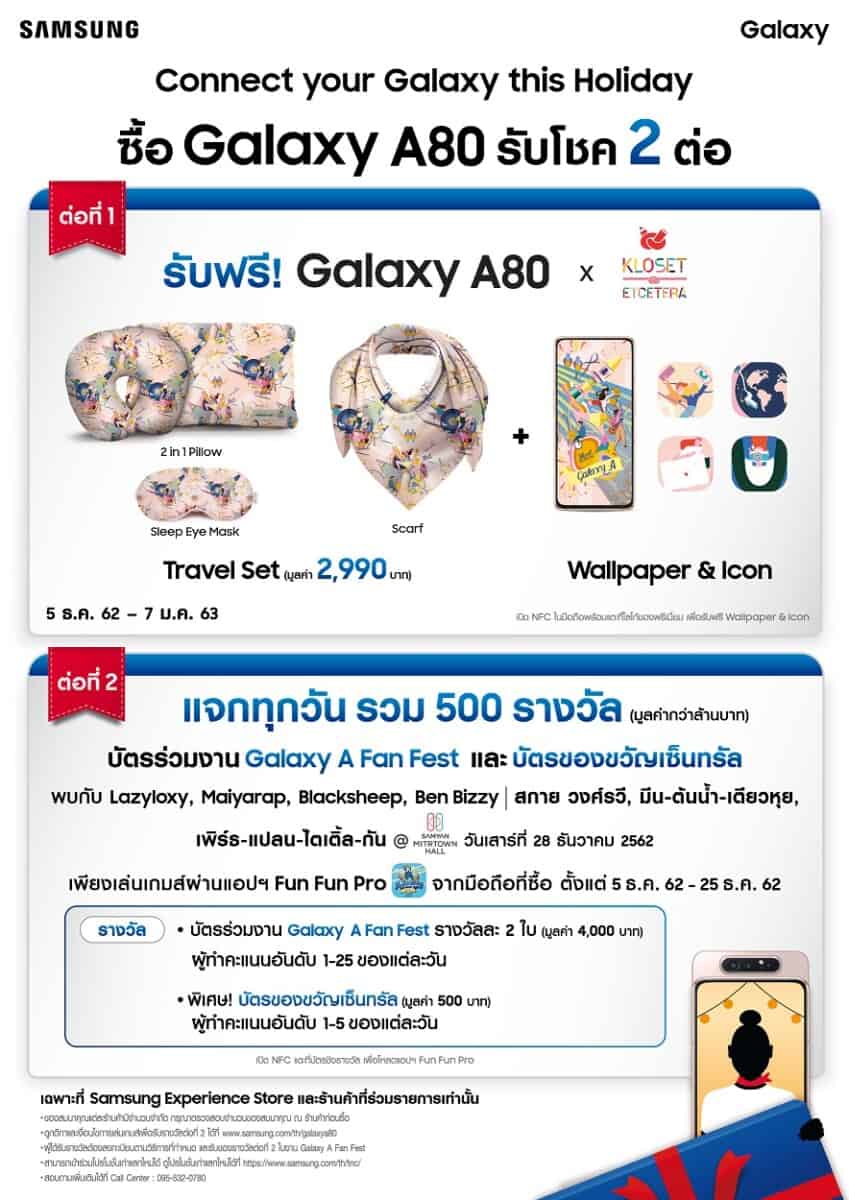 ไฮไลท์สุดพิเศษ เมื่อซื้อสมาร์ทโฟน ซัมซุง กาแลคซี่ เอ 80 รับทันที Travel Set สุดพิเศษจาก “Kloset and Etcetera” แบรนด์แฟชั่นสัญชาติไทยชื่อดัง ประกอบด้วย 1. 2in1 Pillow 2. Sleep Eye Mask 3. ผ้าพันคอพิมพ์ลายอันเป็นเอกลักษณ์ของแบรนด์และเป็นลายลิมิเต็ด