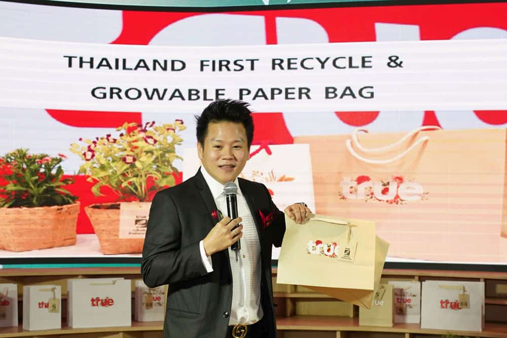 นายโอลิเวอร์ กิตติพงษ์ วีระเตชะ หัวหน้าคณะผู้บริหารด้านแบรนด์และการสื่อสาร บมจ. ทรู คอร์ปอเรชั่น กล่าวว่า ตลอด 30 ปีที่ผ่านมา กลุ่มทรู ดำเนินงานขับเคลื่อนด้านความยั่งยืนของบริษัทอย่างต่อเนื่องและเป็นรูปธรรม ตามยุทธศาสตร์ภายใต้กรอบ 3 H’s: Heart Health Home ครอบคลุมครบ 3 มิติ ทั้งด้านเศรษฐกิจ สังคม และสิ่งแวดล้อม ที่มีบทพิสูจน์จากการติดอันดับกลุ่มดัชนีความความยั่งยืนระดับโลก ดาวโจนส์ – Dow Jones Sustainability Indices (DJSI) ประเภท Emerging Markets 3 ปีซ้อน ด้วยคะแนนที่ 1 ของโลกในหมวดธุรกิจสื่อสารโทรคมนาคมติดต่อกันเป็นปีที่สอง ล่าสุด ทรู ย้ำความเป็นผู้นำดิจิทัล ไลฟ์สไตล์ ที่มีความรับผิดชอบต่อสังคม ประกาศยกเลิกการใช้ถุงพลาสติกในทรูช้อป นำร่อง 10 แฟล็กชิพ สโตร์ และนำถุงกระดาษที่ผลิตจากกระดาษคราฟต์รีไซเคิลมาให้บริการทดแทน ด้วยการออกแบบลวดลายดอกไม้สวยงาม เห็นถึงการสร้างแบรนด์ด้วยงานศิลปะที่เน้นประโยชน์การใช้สอย ดีไซน์โดดเด่นและมีเอกลักษณ์ ไม่คำนึงถึงยุคสมัย ไม่ตามเทรนด์ แต่เน้นความคลาสสิก ใช้ได้นาน รังสรรค์ขึ้นมาให้เหมาะกับหลากหลายเทศกาลในแบบร่วมสมัย สะท้อนเสน่ห์ของแบรนด์แบบใหม่ที่เน้นธรรรมชาติ รักษ์โลก โดยในแต่ละปี ทรู ใช้ถุงพลาสติกในการให้บริการจำนวน 3 ล้านใบต่อปี การใช้ถุงกระดาษจะสามารถลดการปล่อยก๊าซคาร์บอนไดออกไซด์ได้ถึง 600,000 กิโลกรัมต่อปี