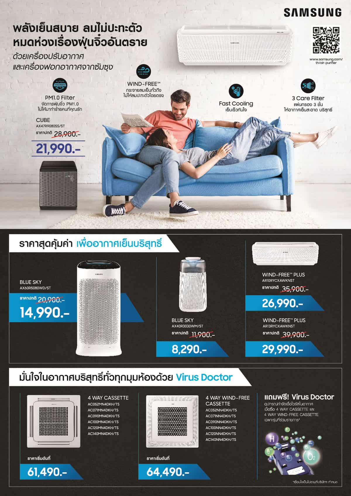 สำหรับผู้ที่สนใจสามารถพบกับโปรโมชั่น “Bring Back Clean Air” มอบอากาศเย็นบริสุทธิ์แก่บ้านของคุณด้วยราคาสุดพิเศษสำหรับเครื่องปรับอากาศและเครื่องฟอกอากาศ สูงสุด 30% และพิเศษ เมื่อซื้อเครื่องปรับอากาศแบบฝังฝ้า 4 ทิศทาง แถมฟรี Virus doctor ได้ที่ https://shop.samsung.com/th/offer/bringbackcleanair ตั้งแต่วันที่ 11 มกราคม 2563 ถึง 29 กุมภาพันธ์ 2563 นี้