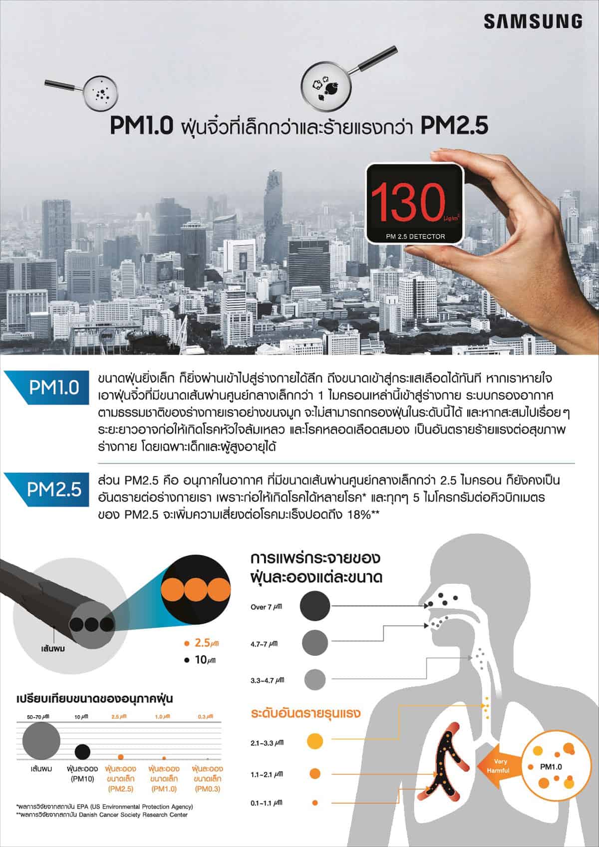 หมดห่วงเรื่องฝุ่นจิ๋วที่แสนอันตราย ซัมซุง ในฐานะผู้นำด้านนวัตกรรมสำหรับเครื่องใช้ไฟฟ้าอันดับหนึ่งของโลก มีการพัฒนาเทคโนโลยีการฟอกอากาศที่สามารถตอบสนองความต้องการของผู้ใช้งานทั้งด้านการดูแลสุขภาพทางเดินหายใจ ด้วยคุณสมบัติการฟอกอากาศได้อย่างดีเยี่ยม สามารถดักจับฝุ่นอนุภาคเล็ก 1 ไมครอนในเครื่องปรับอากาศ และในเครื่องฟอกอากาศสามารถดักจับฝุ่นอนุภาคขนาดเล็กกว่า 0.3 ไมครอน ซึ่งเป็นฝุ่นละอองที่มีขนาดเล็กกว่า PM 2.5 ได้ถึง 99.9 เปอร์เซ็นต์ สามารถสั่งการผ่านแอปพลิเคชั่น SmartThings มาพร้อมกับเทคโนโลยี Wind-FreeTM Cooling ซึ่งเป็นเอกสิทธิ์เฉพาะจากซัมซุงที่ให้ความเย็นสบายโดยไม่มีลมมาปะทะตัว อีกทั้งมีดีไซน์ตอบโจทย์ไลฟ์สไตล์ของผู้ใช้ช่วยผู้ให้สามารถวางใจได้ว่าเครื่องปรับอากาศและเครื่องฟอกอากาศจากซัมซุงจะสามารถมอบอากาศบริสุทธิ์เพื่อสุขภาพที่ดีให้แก่คุณและคนที่คุณรักอย่างแน่นอน