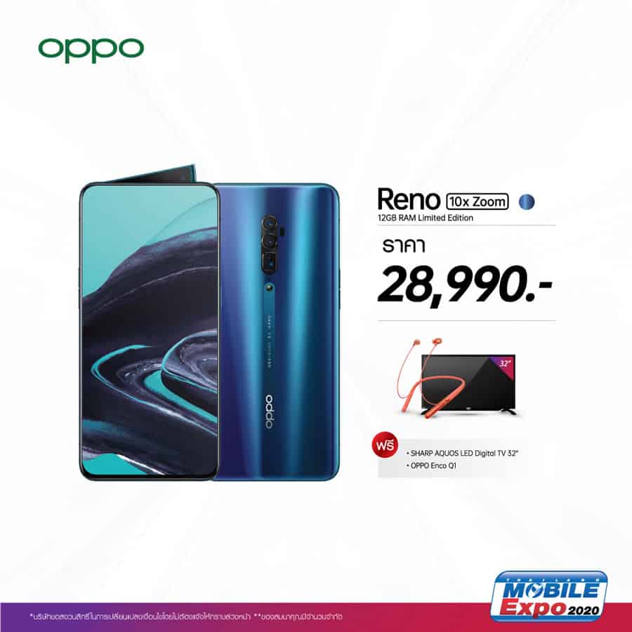 กลับมาอีกครั้งกับ โปรโมชัน OPPO ในงาน Thailand Mobile Expo 2020 รอบนี้จัดเต็มทั้งส่วนลดราคา และของแถมมีให้ทุกรุ่น พิเศษสุด ซื้อ OPPO Reno 10x Zoom 12GB RAM Limited Edition รับไปเลย ทีวี 32 นิ้ว และหูฟัง OPPO Enco Q1 ฟรี!