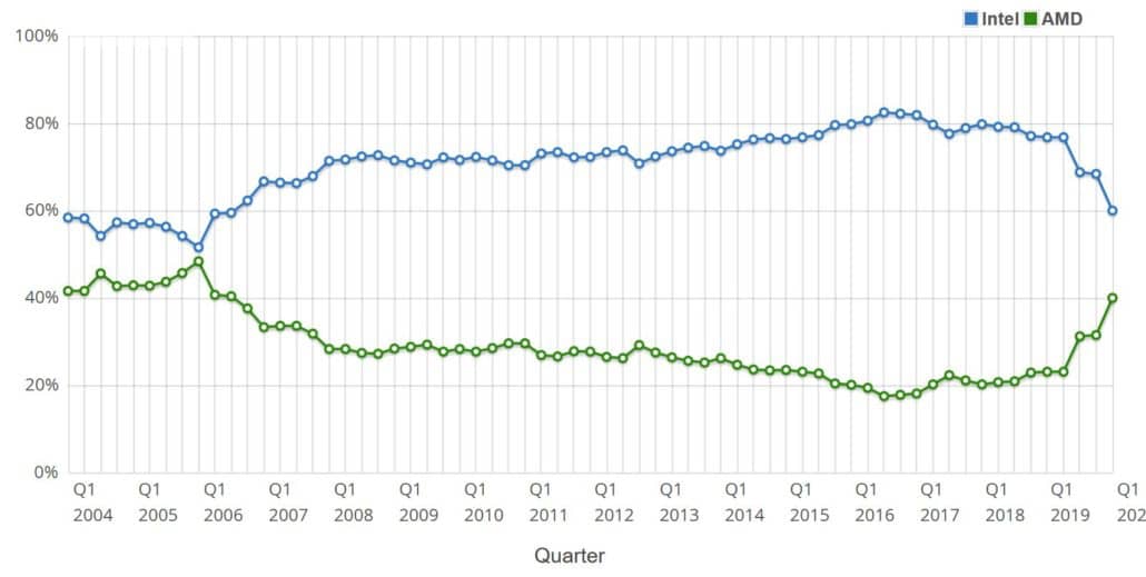 ถือเป็นข่าวที่น่ายินดีมากกับทาง AMD นี่เป็นครั้งแรกในรอบ 14 ปี ที่ CPU ของทาง AMD มีส่วนแบ่งทางการตลาดที่เยอะเป็นที่น่าพอใจ โดยทาง PassMask รายงานว่า ส่วนแบ่งทางการตลาดของ AMD นั้น ได้เพิ่มขึ้นมาเป็น 40% ในปี 2019