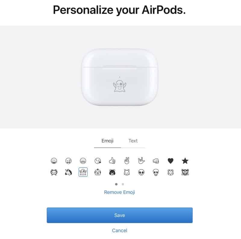 ลูกค้าที่ซื้อ AirPods สามารถเลือกได้เลย ว่า จะสลักด้วย ตัวอักษร หรือ สลักเป็น emoji แต่ตอนนี้มีจำกัดให้เลือกได้ทั้งหมด 20 ตัวด้วยกัน ตัวอย่างที่เห็นก็คือ