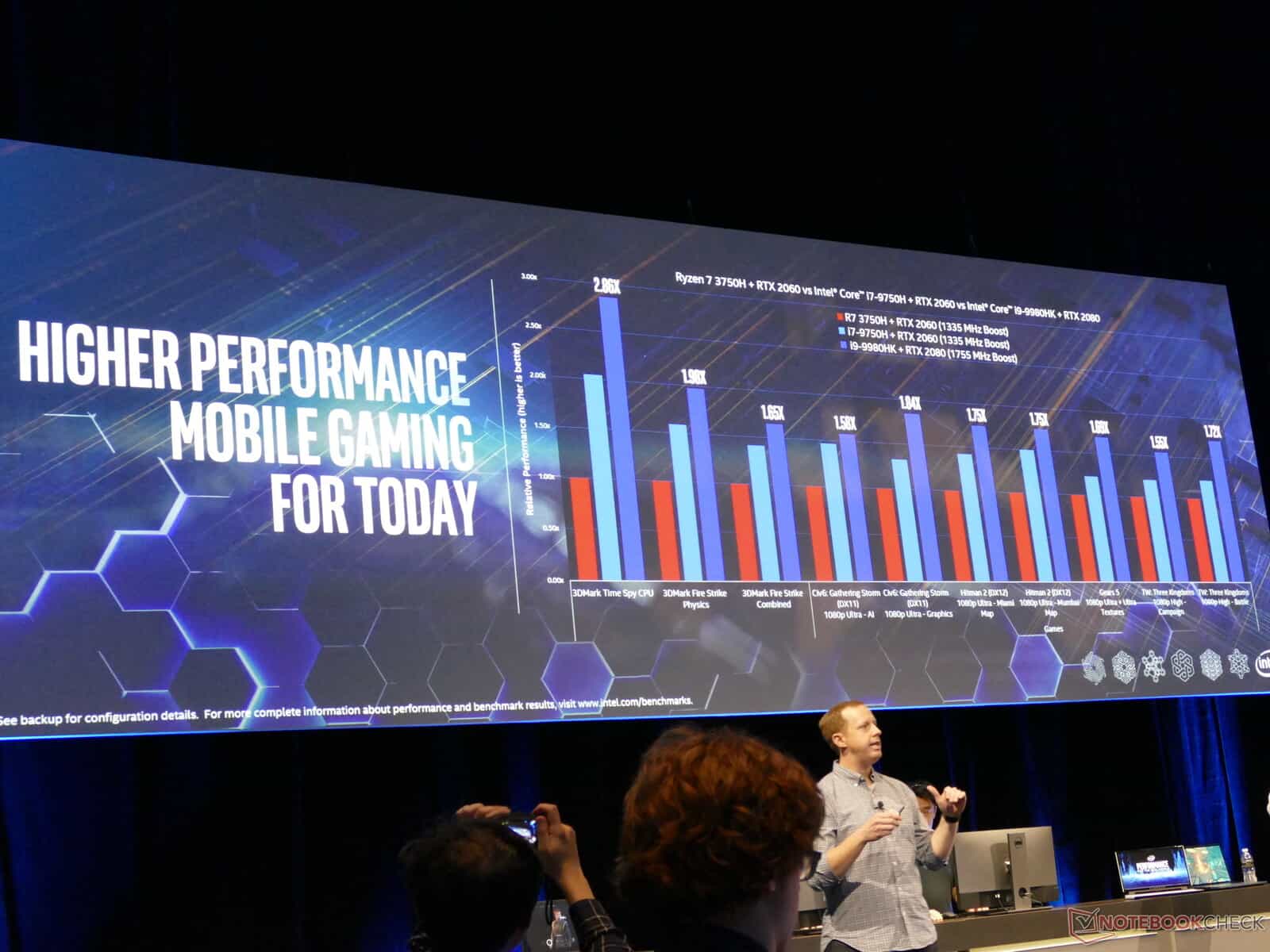 ทาง Intel ยังเปรียบเทียบ performance ระหว่าง AMD Ryzen 7 3750H กับ Core i7-9750H และ Core i9-9980HK ร่วมกับ GPU ตัว NVIDIA GeForce RTX 2060 และ RTX 2080